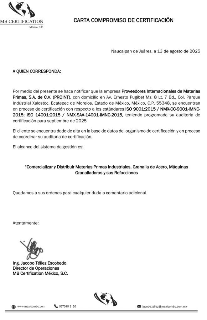 En Proveedores Internacionales de Materias Primas, S. A. de C. V. es una empresa dedicada a comercializar y distribuir materias primas industriales, granalla de acero, máquinas granalladoras y sus refacciones. Y tenemos el compromiso en: